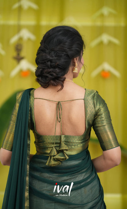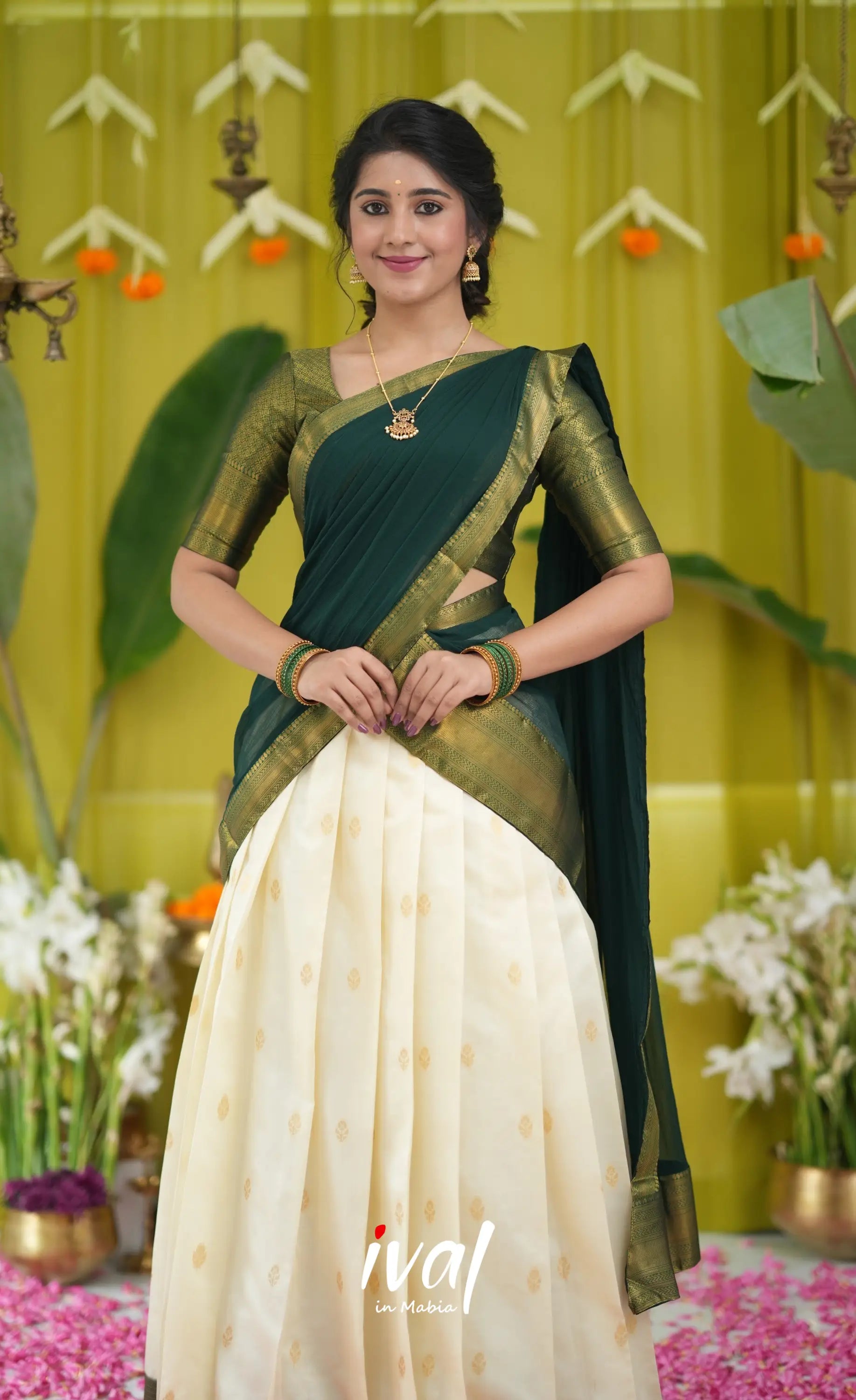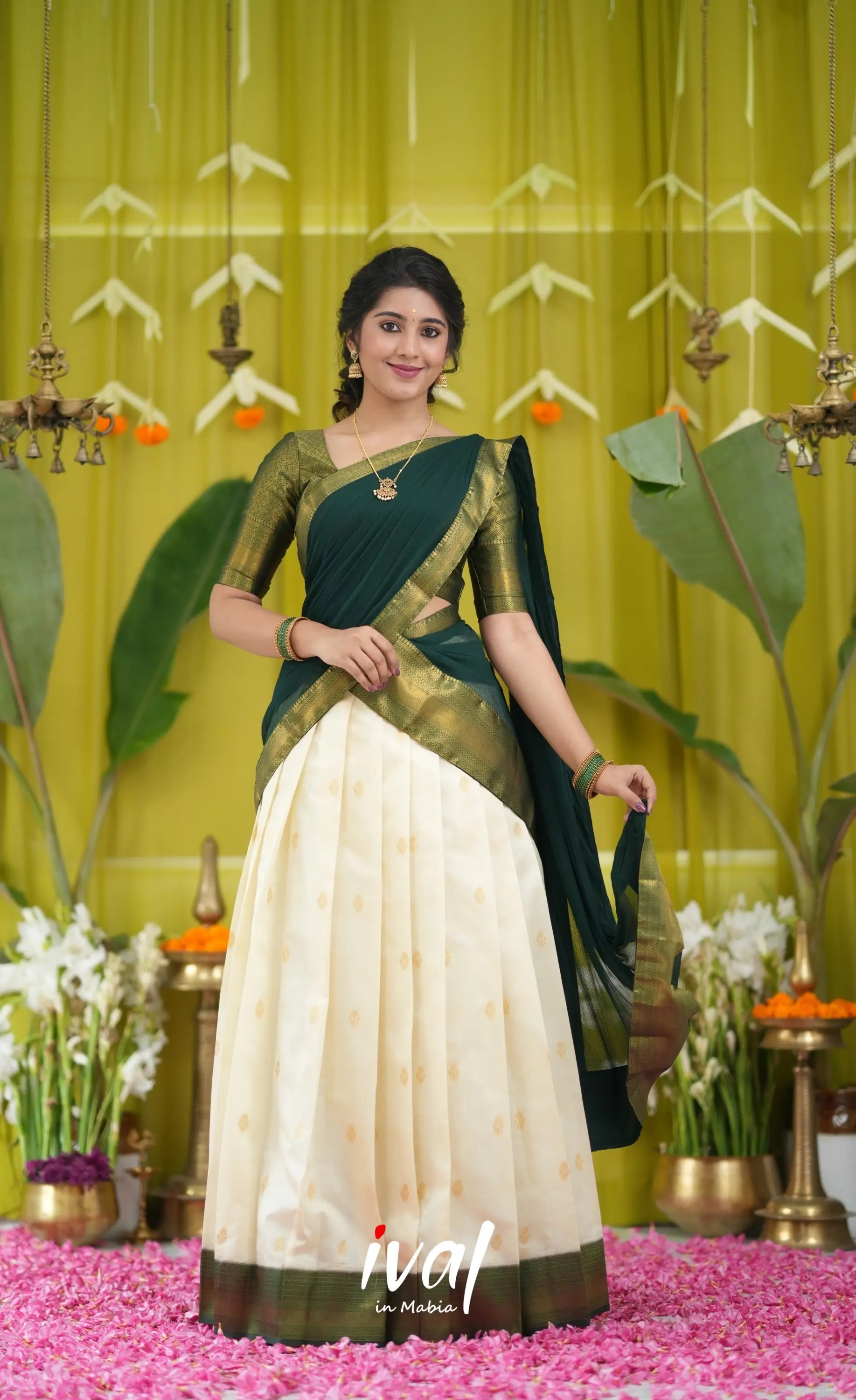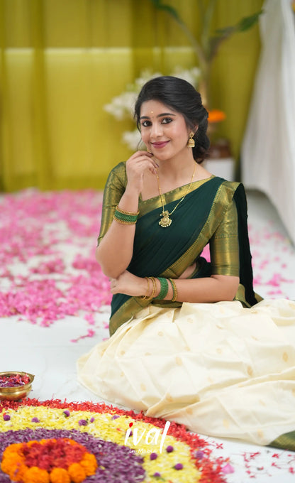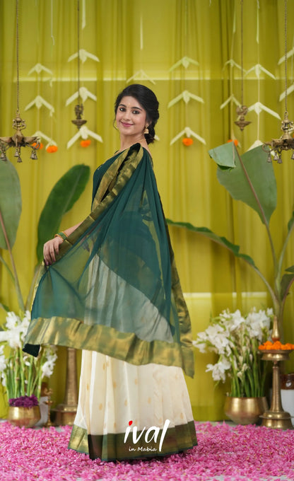 Off white and Bottle Green Blended Silk Halfsaree