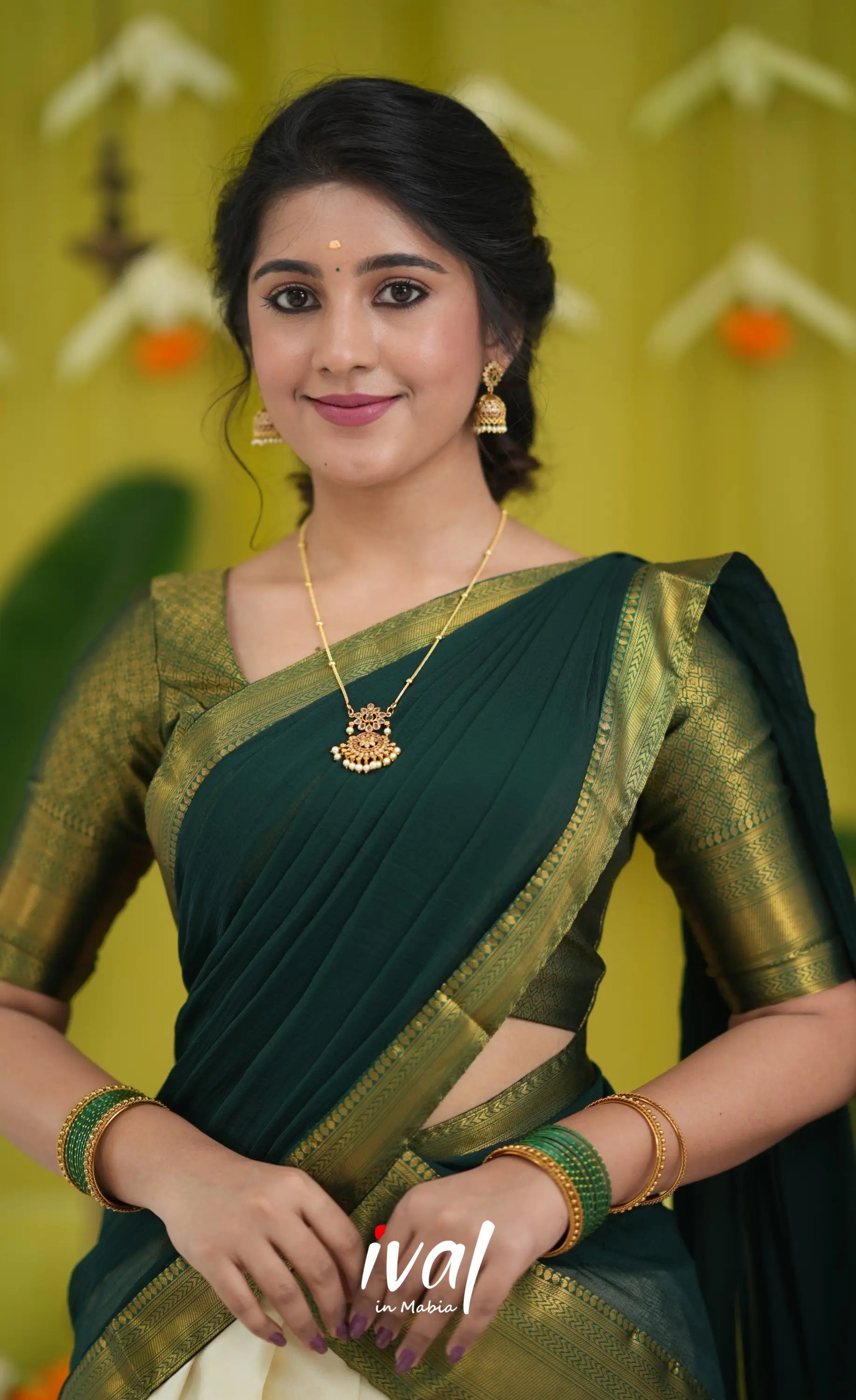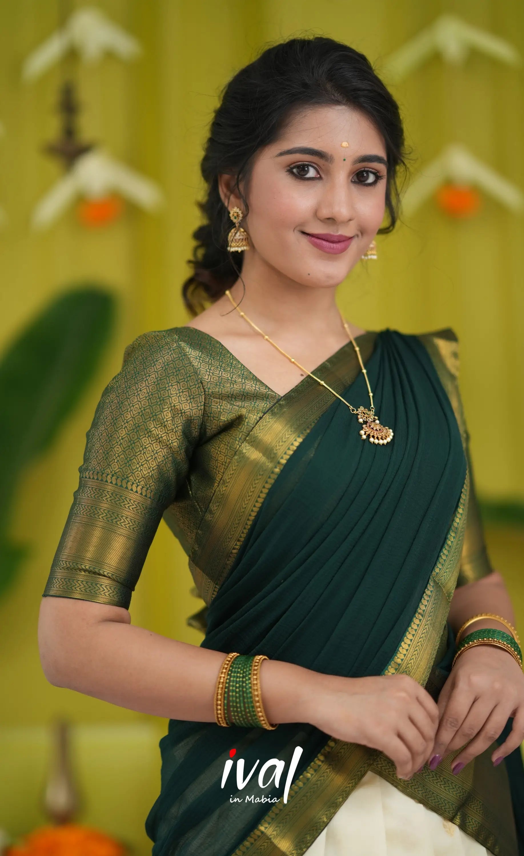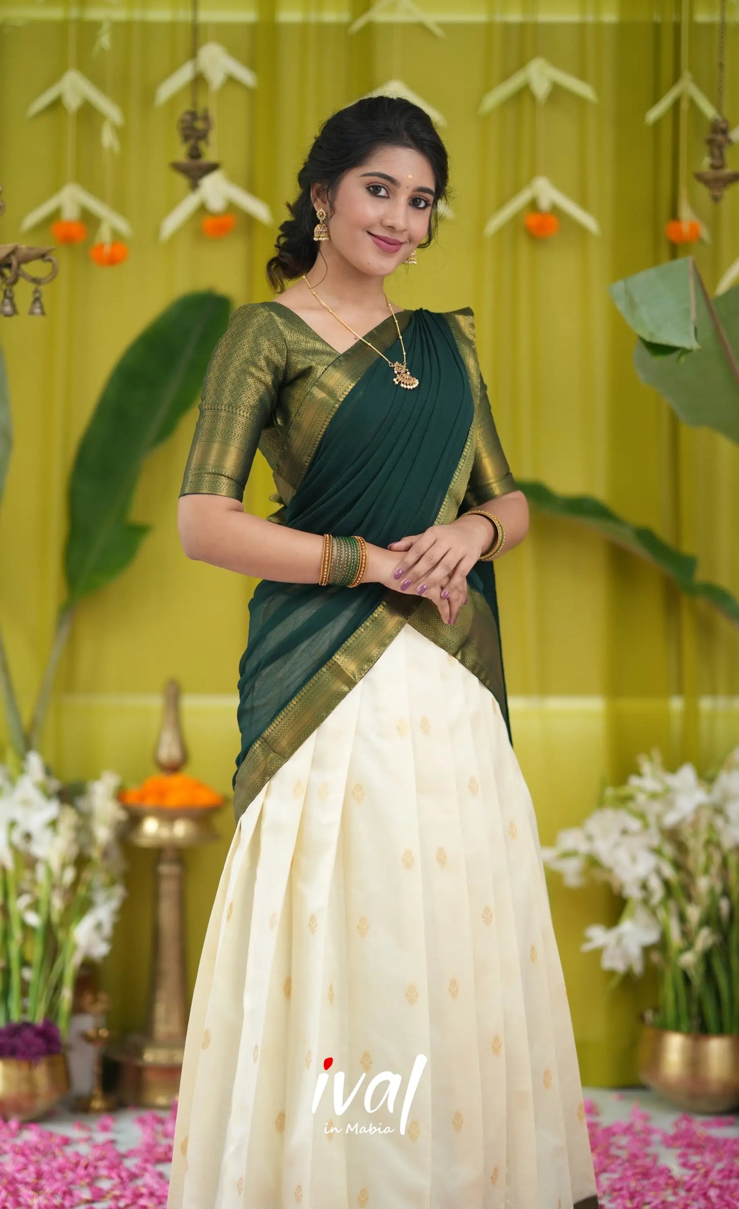 Off white and Bottle Green Blended Silk Halfsaree