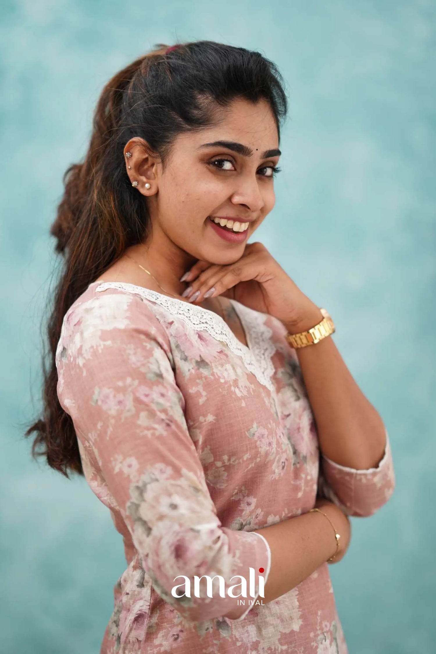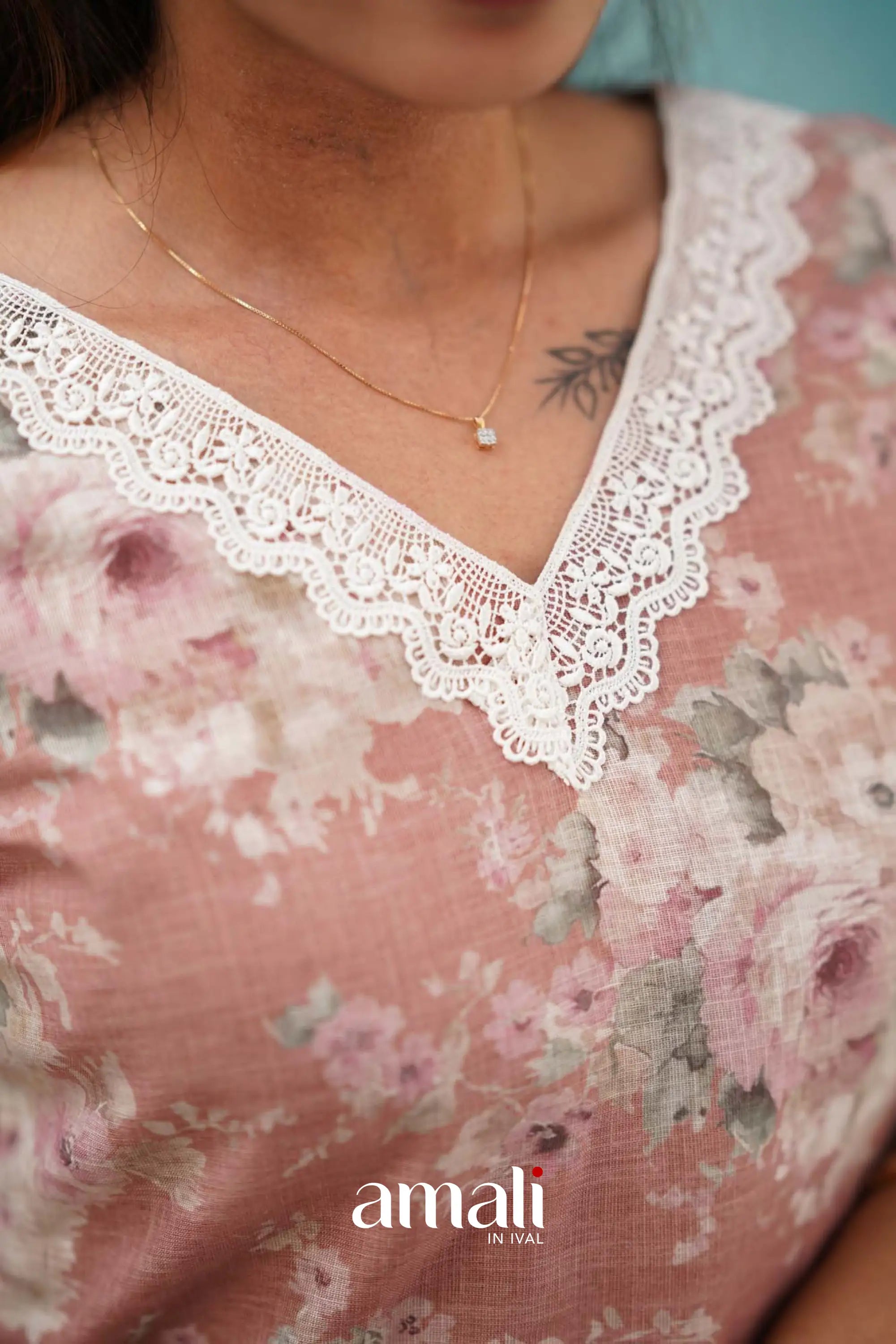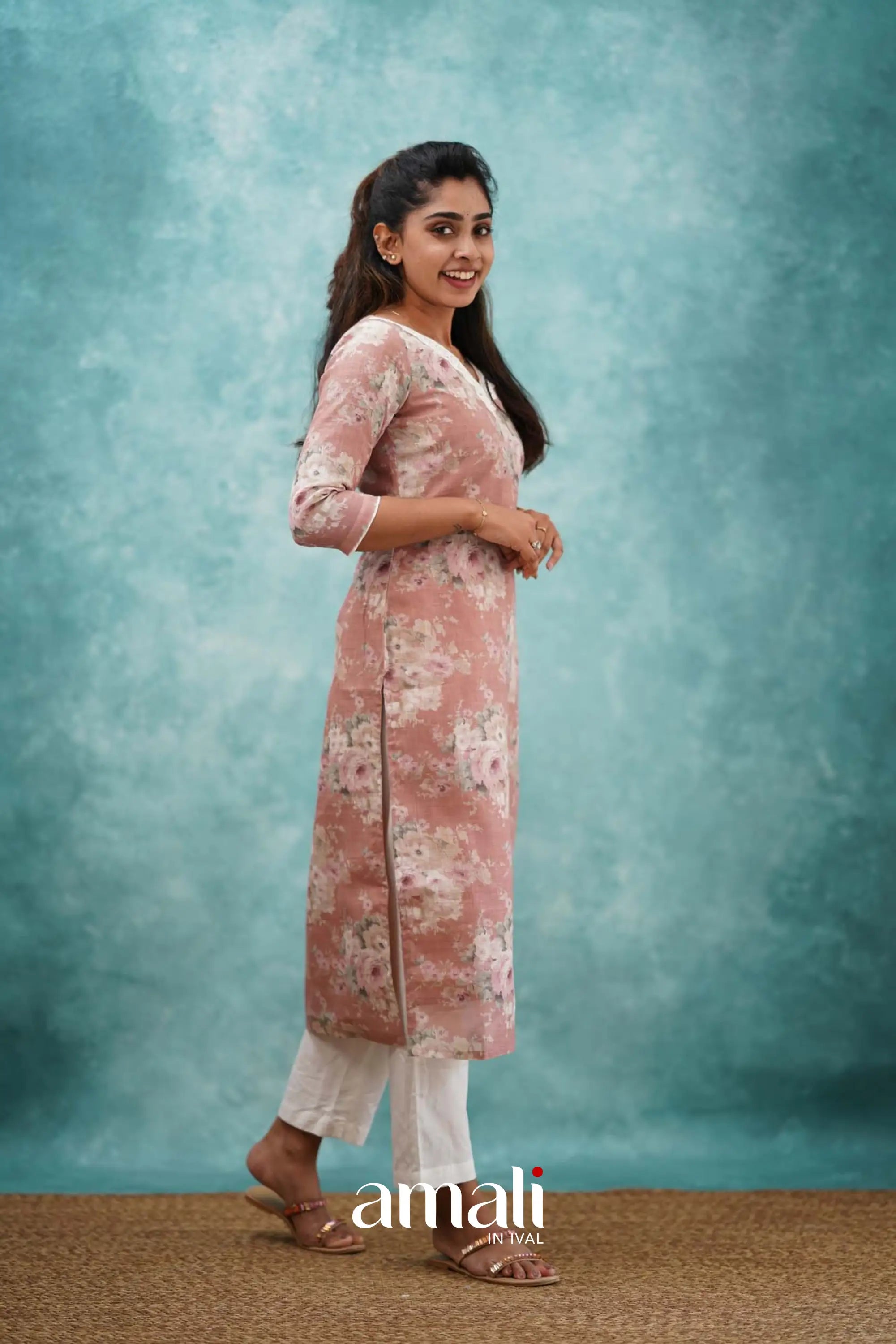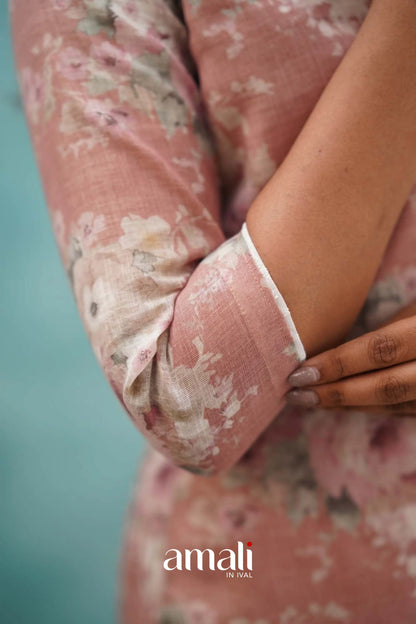 A beautiful semi linen co ord set in shades of peach embellished with digital floral bunche prints all over for a stylish look.